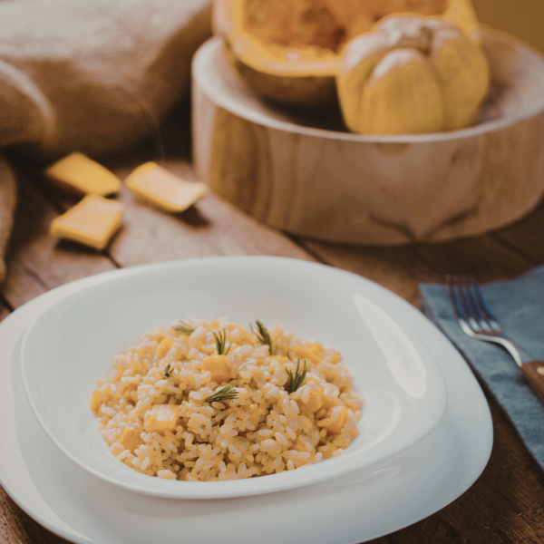 A abóbora é rica em fibras, betacaroteno e minerais, além de oferecer doçura natural e cremosidade ao prato. Quando incorporada ao risoto, ela equilibra o sabor do arroz e reduz a necessidade de gorduras em excesso.