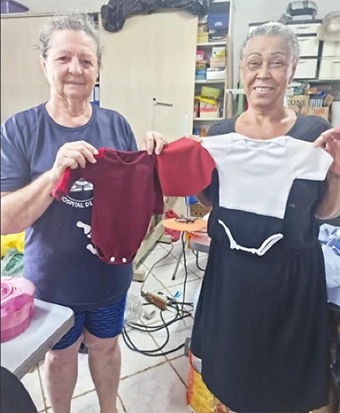 Com a ajuda de mais seis costureiras voluntárias, elas lideram três projetos que produzem enxovais para recém-nascidos e peças infantis.