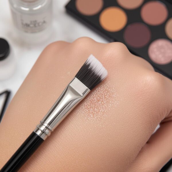 - A Mistura: Com o pincel chanfrado, misture o líquido e o pó até ficar homogêneo. Teste primeiro nas costas da mão para ver se a textura está pigmentada o suficiente.
