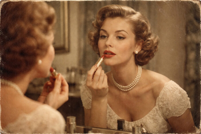 Enquanto os olhos expressavam delicadeza, os lábios se tornavam o grande destaque da maquiagem. O batom vermelho clássico reinava absoluto, acompanhado por variações em rosa, coral e tons mais fechados, sempre com contorno bem marcado. Os lábios eram cuidadosamente desenhados e simbolizavam feminilidade, elegância e confiança, reforçando a imagem idealizada da mulher da época.