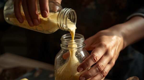 - A Escolha do Recipiente: Pegue uma garrafa de vidro ou um pote resistente com uma tampa que vede perfeitamente. Despeje o creme de leite fresco até preencher apenas a metade do vidro, deixando bastante espaço vazio para que o líquido possa se movimentar com força.