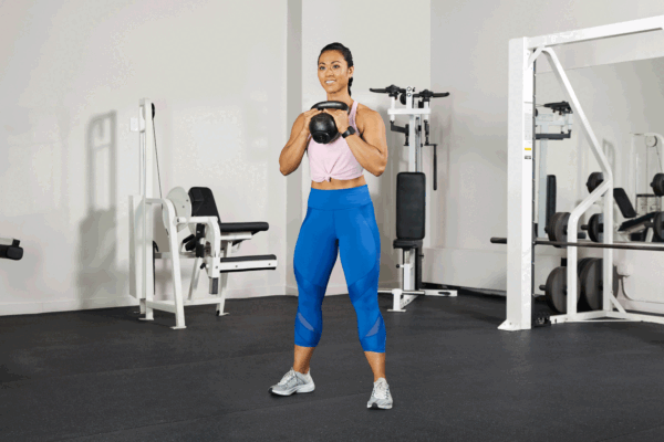 Segurando o peso na frente do peito, o que ajuda iniciantes a manterem o tronco ereto naturalmente.